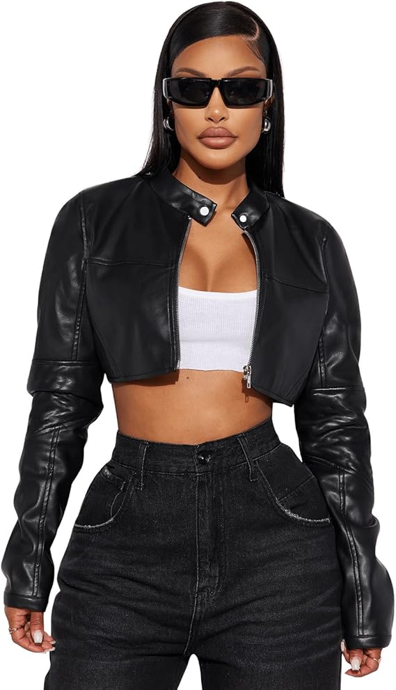 Elevate your wardrobe with a stylish edge through this sleek women’s faux leather cropped jacket. Combining the timeless appeal of a motorcycle jacket with the comfort of a bomber style, it offers both fashion and function.